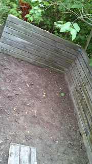 Min kära mamma (som här i bloggen mest kallas för mormor) har ju renoverat huset redan, så under denna sommar är det trädgården som stått i fokus. Det blir så fint så fint! Nu hade hon en plan på en ny fin kompost med flera sektioner för att ha olika stadier och förbränning på g samtidigt. Jag kommer in i bilden som förste verktygshanterare och andre tyckare ;) Grundmaterialet vi gick efter var faktiskt den trall som tidigare låg på balkongen här hemma. Virket var helt ok så det var ju onödigt att slänga. Återanvändning är bra grejjer! :) Så trallen fick bli 4 lika stora sektioner på 150*75 cm och de sattes fast med stolp ner i marken och sen vinkeljärn för att fästa dem i varandra: